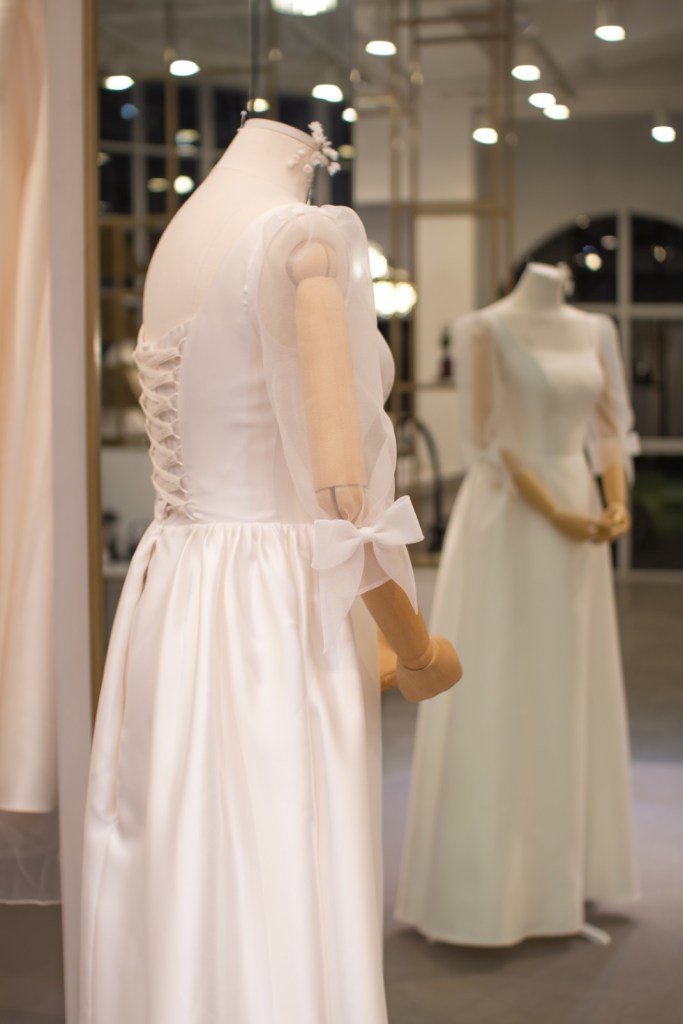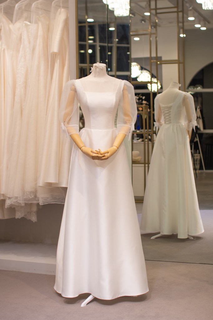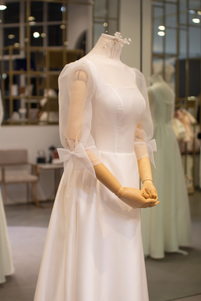 깨끗한 실크 소재의 정갈함과 구름처럼 가벼운 오간자 퍼프 소매가 조화를 이루며, 소매 끝단에 더해진 앙증맞은 리본 디테일이 사랑스러운 포인트가 되어줍니다. 스퀘어 네크라인이 목선을 시원하고 우아하게 드러내어, 군더더기 없는 미니멀함 속에 소녀스러운 감성을 담고 싶은 신부님께 완벽한 선택이 되어줍니다.