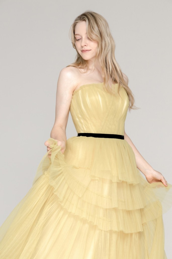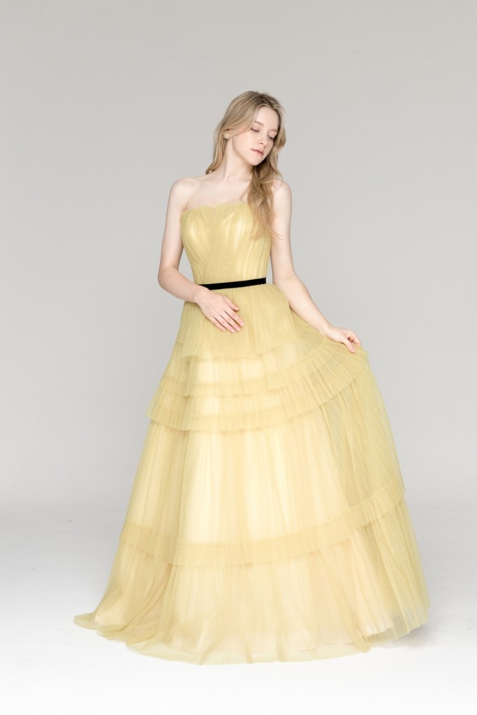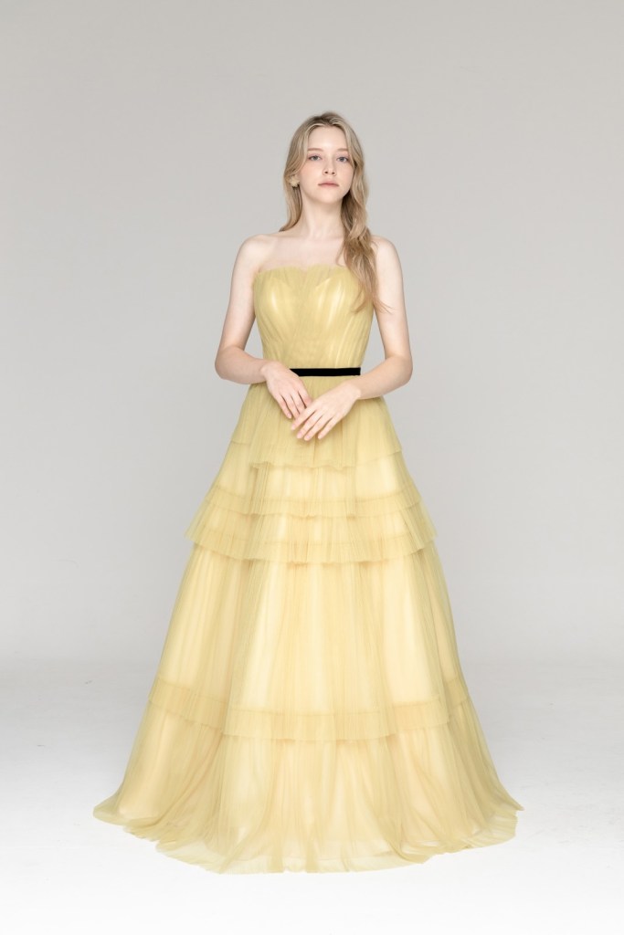 싱그러운 옐로우 컬러와 섬세한 플리츠 튤 소재가 겹겹이 쌓인 티어드 디자인이 조화를 이루며, 허리 라인의 블랙 벨트 포인트가 세련된 대조를 만들어 한층 감각적인 실루엣을 완성합니다.