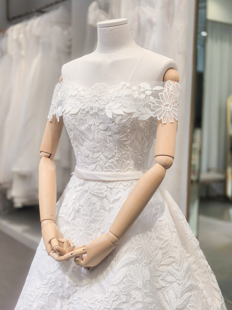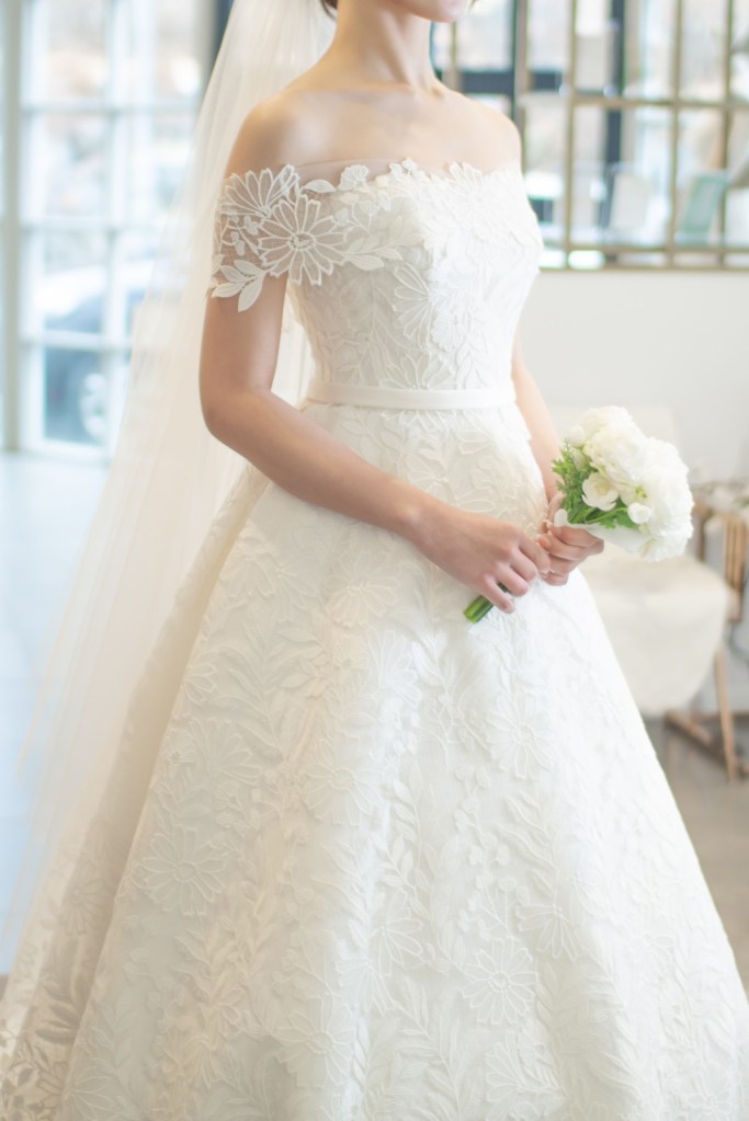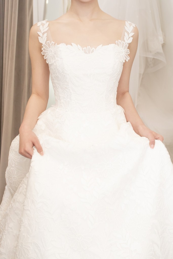 드레스 위로 촘촘히 피어난 잔잔한 꽃잎들이 신부님의 화사함을 극대화하며, 맑고 깨끗한 화이트 톤에 입체적인 레이스 자수가 더해져 청순하면서도 로맨틱한 무드를 완성합니다.
