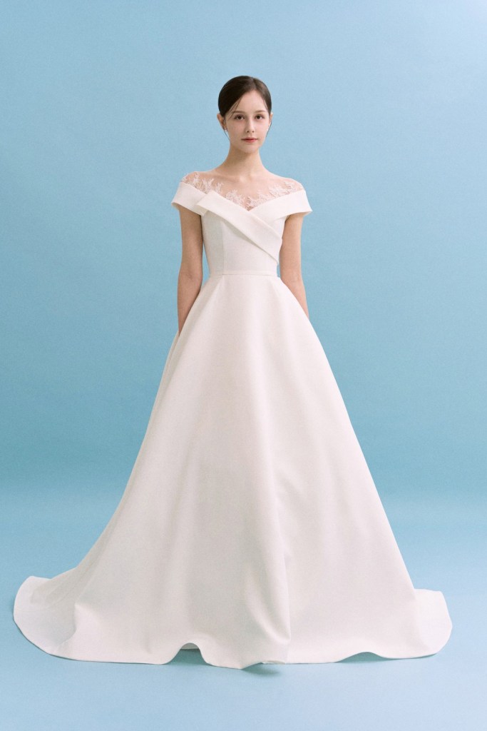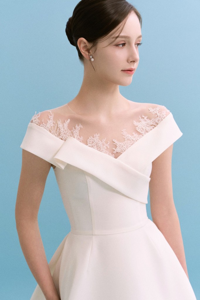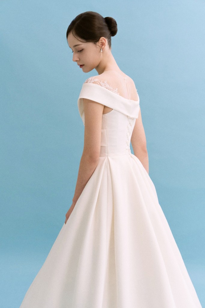 어깨 끝을 타고 흐르는 정갈한 랩 디테일과 화사한 레이스의 조화가 돋보이며, 클래식한 오프숄더 디자인에 현대적인 감각을 더해 신부님의 단아하고 고혹적인 매력을 극대화합니다. 군더더기 없이 깨끗한 스커트 라인이 고결한 신부의 분위기를 완성하며, 어느 각도에서도 안정감 있고 기품 있는 실루엣을 선사합니다.
