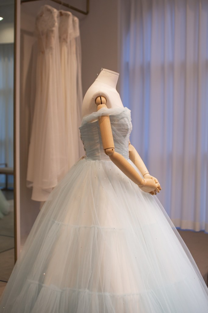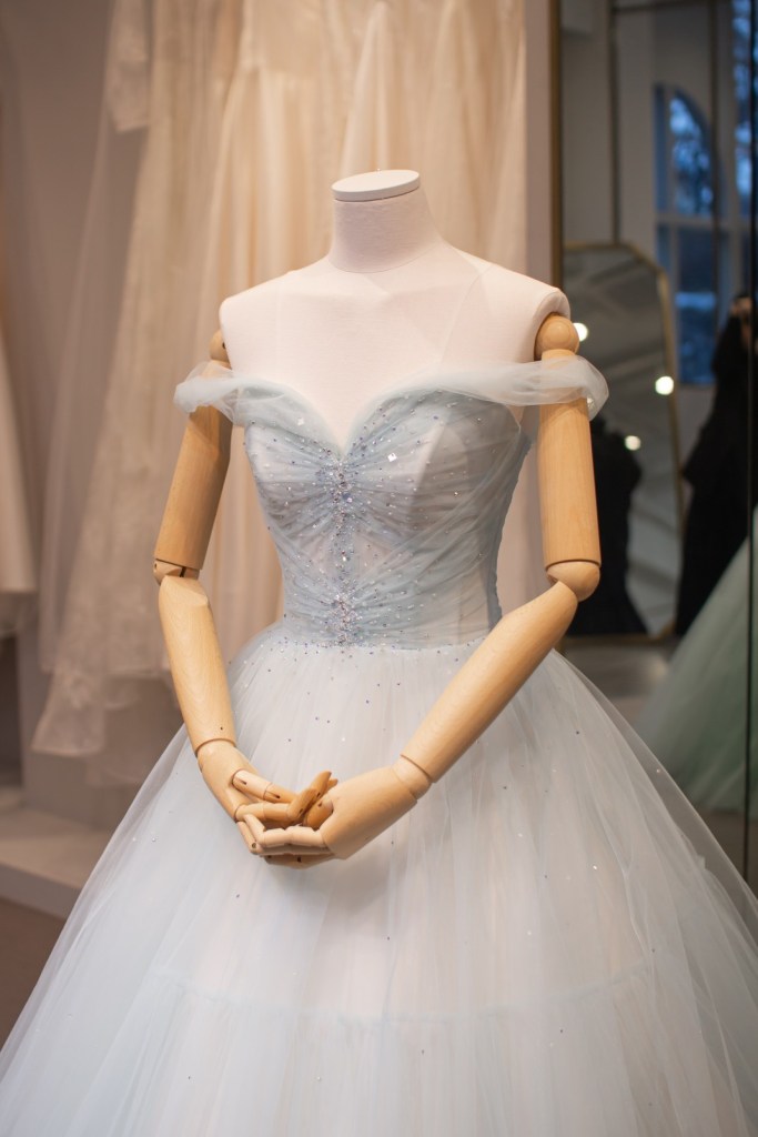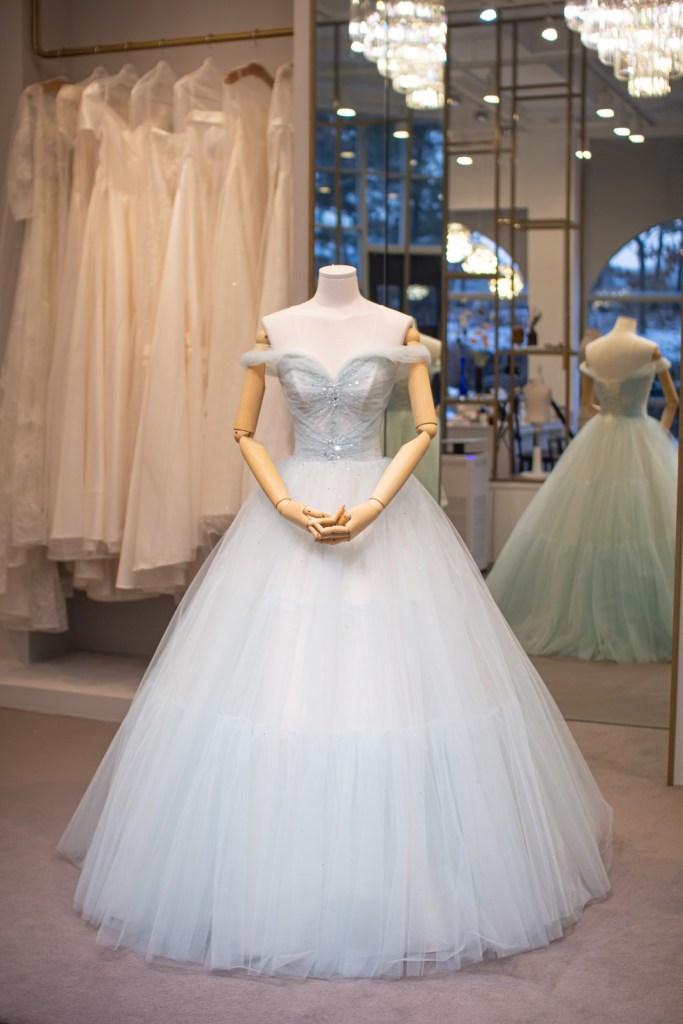 은은한 광택이 감도는 아이스 블루 컬러가 신부님의 피부 톤을 더욱 투명하게 밝혀주며, 드레스 전체에 흩뿌려진 듯한 비즈 디테일이 마치 별빛이 쏟아지는 듯한 몽환적인 분위기를 자아냅니다.