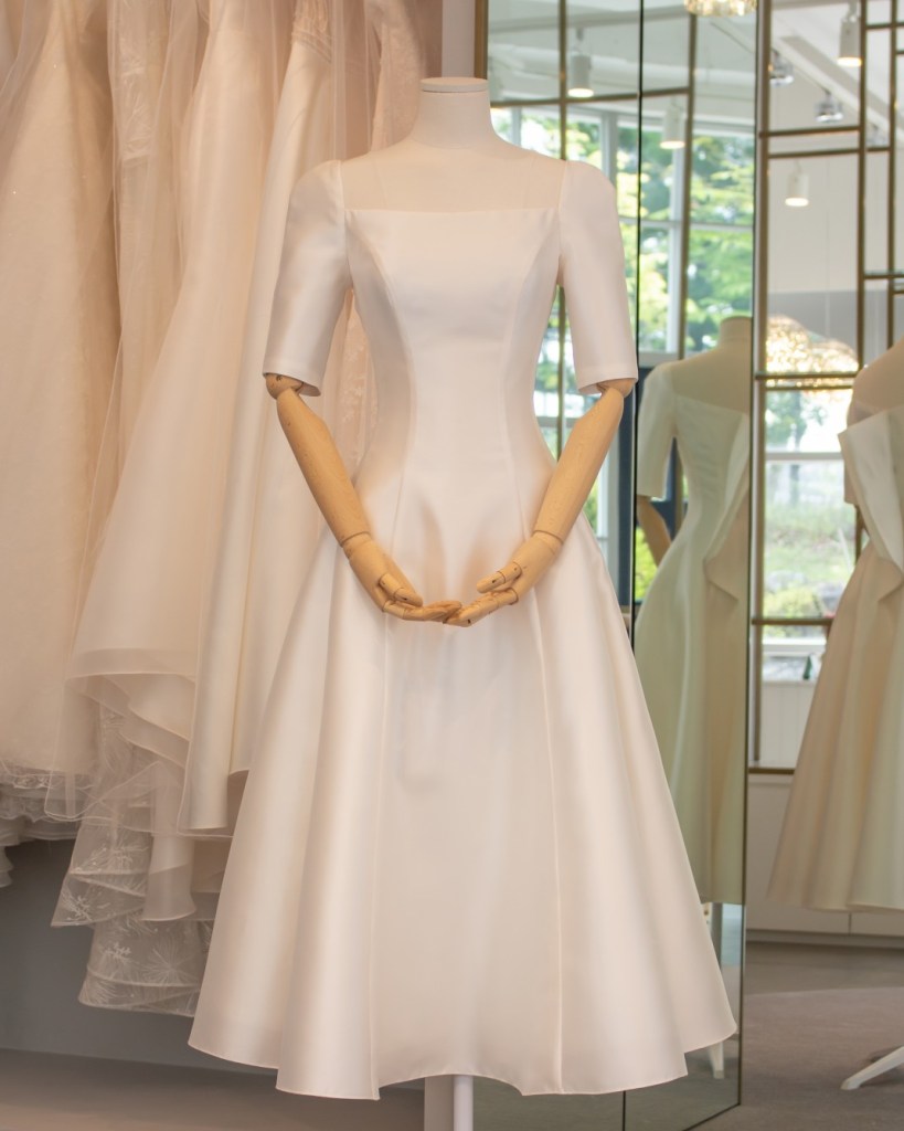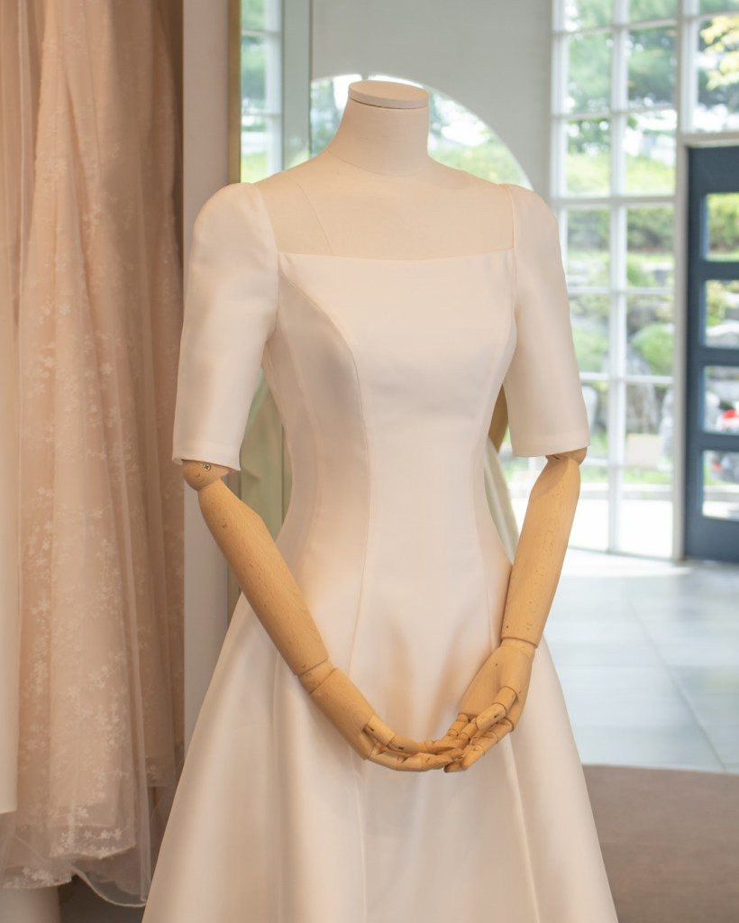 매끄러운 소재가 주는 정갈한 무드와 직선적인 스퀘어 네크라인이 조화를 이루며, 팔꿈치까지 내려오는 슬림한 소매 라인이 미디 길이의 A라인 실루엣과 어우러져 한층 고결하고 현대적인 우아함을 완성합니다.