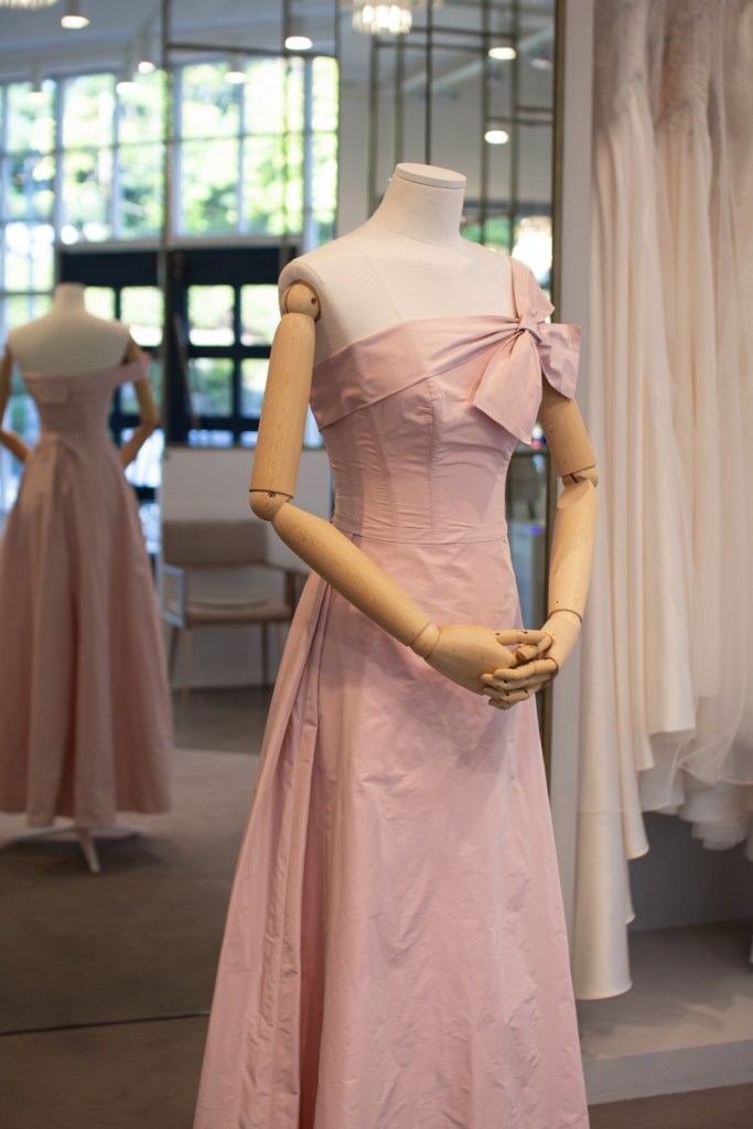 우아하고 세련된 더스티 핑크 컬러가 매력적이며, 흔치 않은 원숄더 실루엣과 볼륨감 있는 리본 장식이 유니크하면서도 로맨틱한 분위기를 완성합니다.