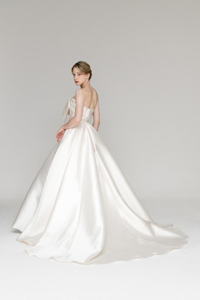 - 리본 장식이 상체의 볼륨감을 살려주어 마른 체형 보정에 탁월하며, 탄탄한 사틴 실크 소재가 허리 라인을 안정적으로 잡아주어 더욱 슬림하고 깨끗한 실루엣을 원하는 신부님께 추천합니다.