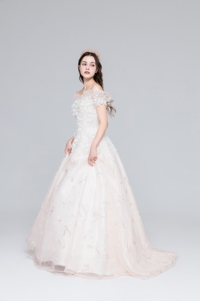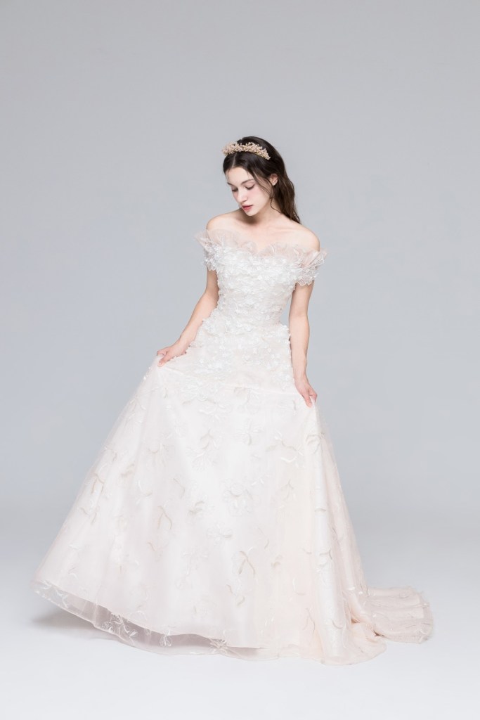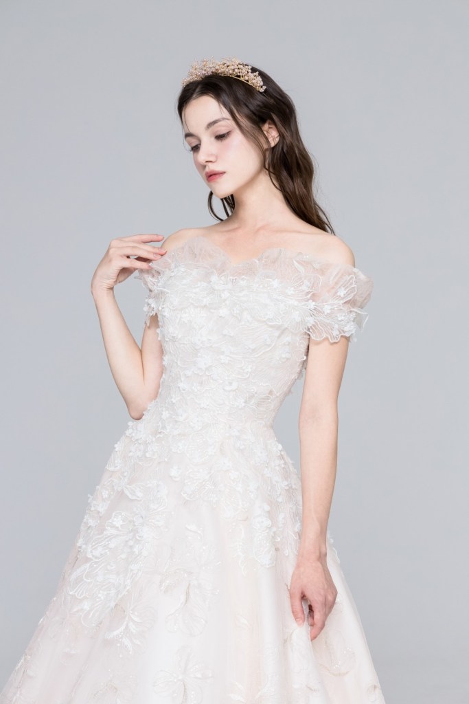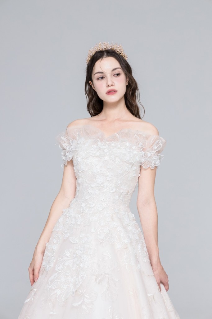 - 가녀린 어깨와 쇄골 라인을 강조하는 오프숄더 디자인으로, 상체 라인을 돋보이게 하고 싶은 신부님께 적극 추천합니다.