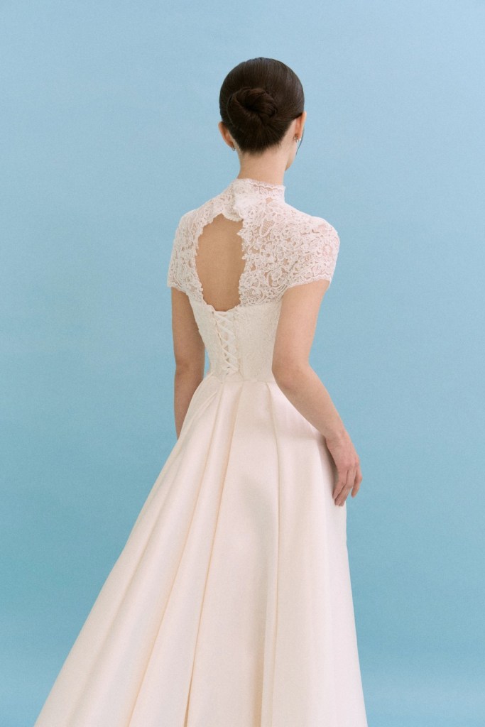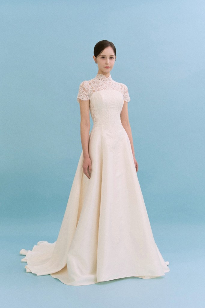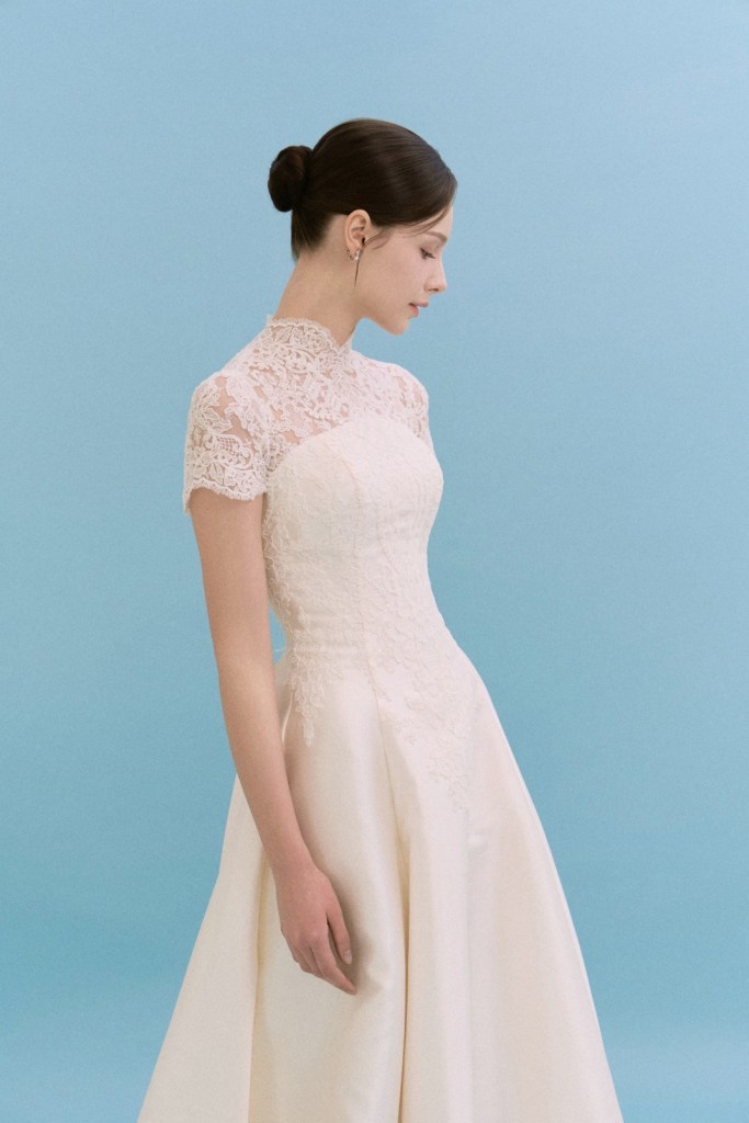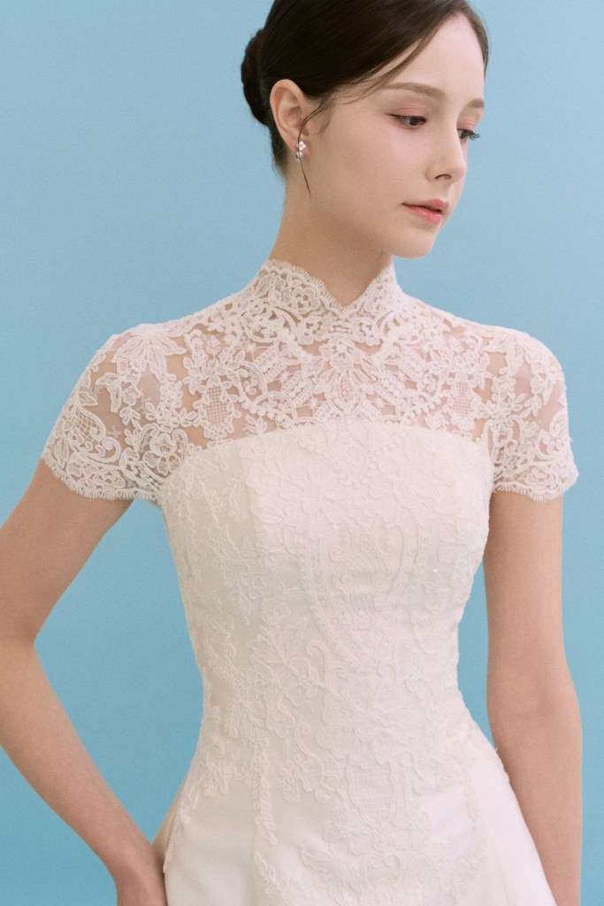 - 목선을 따라 정교하게 올라오는 하이넥 레이스가 특징으로, 노출을 최소화하면서도 고결한 분위기를 내고 싶은 신부님께 추천합니다.