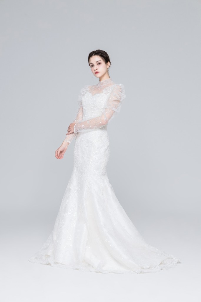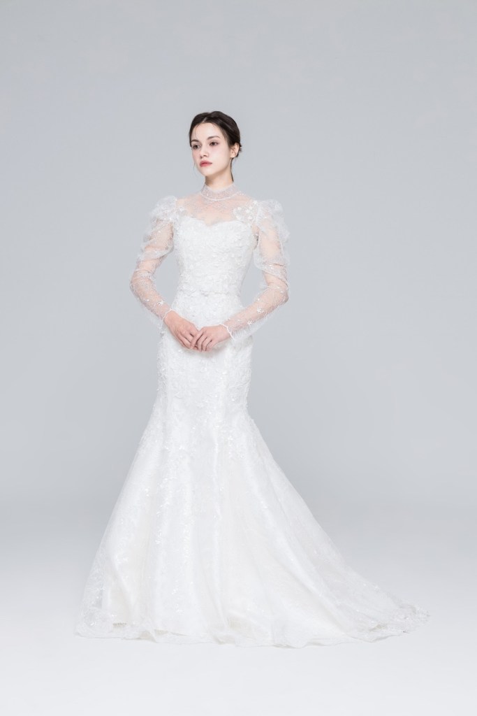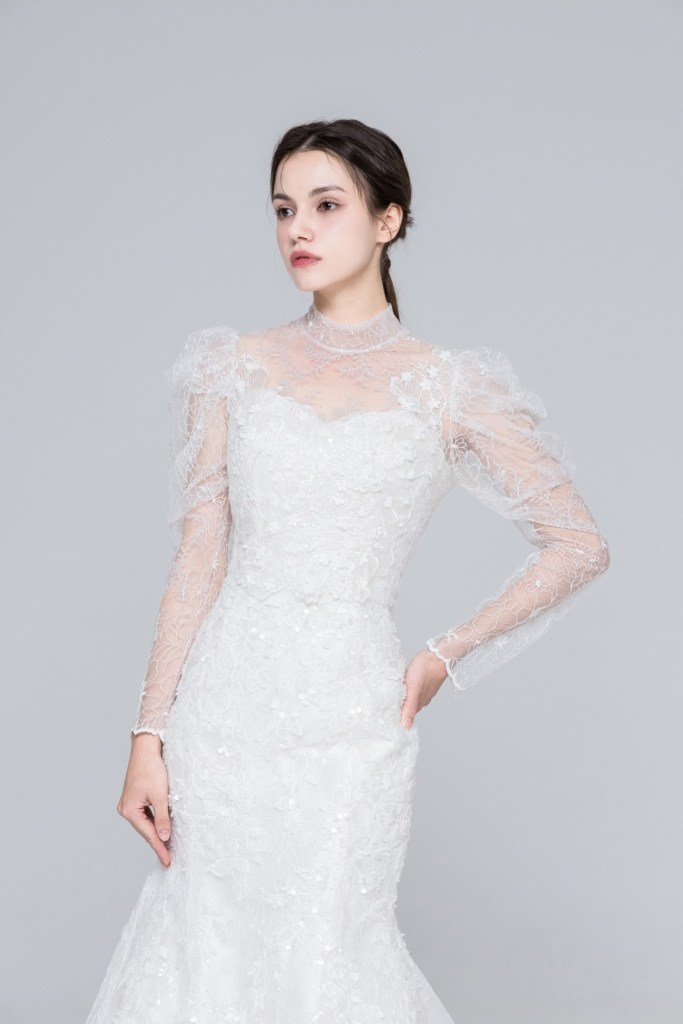 - 상체를 우아하게 커버하면서도 몸매 라인을 살려주는 슬림 머메이드 실루엣으로 구성되어 있어, 단정하면서도 여성스러운 곡선미를 강조하고 싶은 신부님께 완벽한 피팅감을 선사합니다.