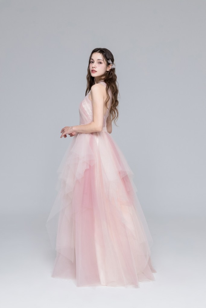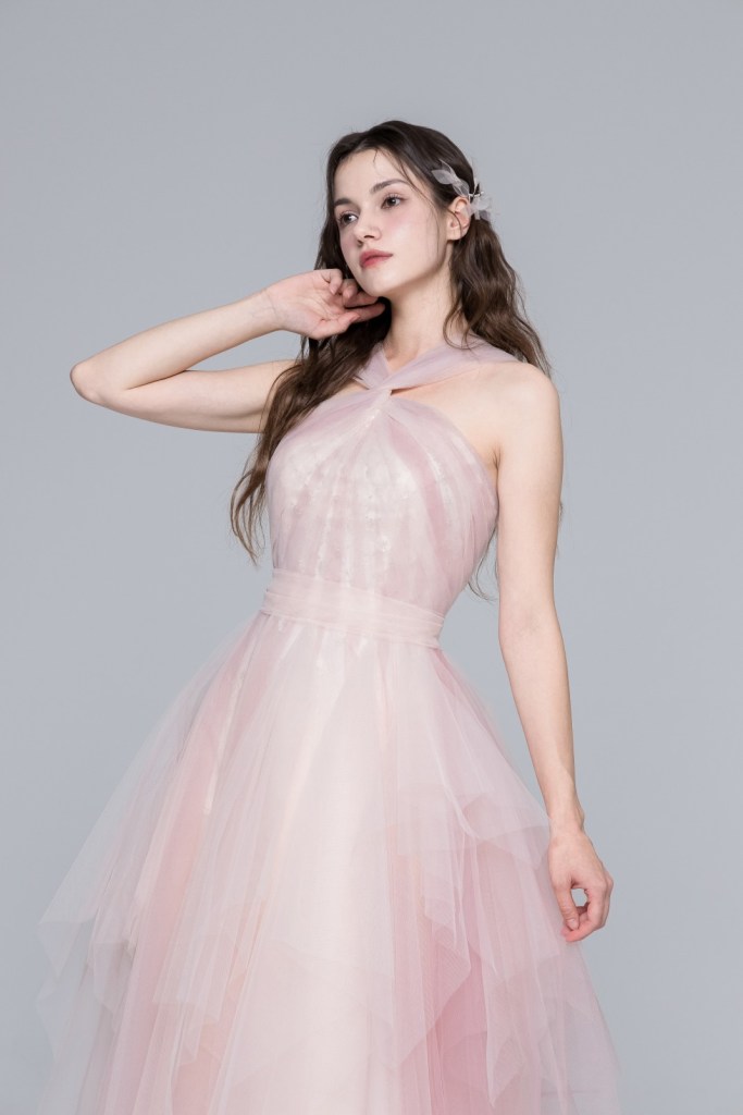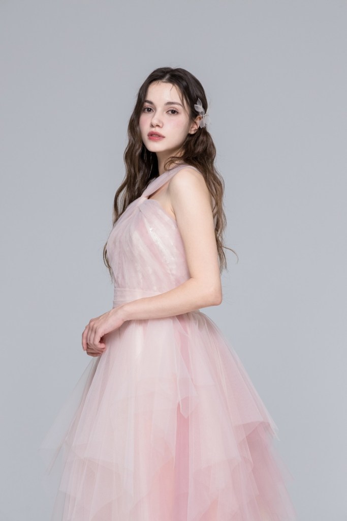 부드러운 피치 핑크 컬러의 색감과 가벼운 튤 소재가 겹겹이 쌓인 입체적인 실루엣이 돋보이는 드레스입니다. 어깨 라인을 감각적으로 가로지르는 홀터넥 디자인이 세련미를 더하며, 층층이 결을 살린 스커트 라인이 움직임마다 몽환적인 분위기를 자아냅니다.
